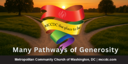 We are filled with gratitude for your blessings upon Metropolitan Community Church of Washington DC, and all spiritual places of worship where everyone gathers to be a blessing to others, obey your word, and find purpose for their lives. Thank you for instilling a generous spirit within us to share and give of ourselves in dedication to building a prosperous and beloved community to perform great works in your name. We willingly share generously of our financial gifts, service, time, talents and treasures to help grow a better world. We are thankful for your generosity of gifts—peace, love, joy, grace, faith, trust, perseverance, endurance, hope. . . Thank you in your precious names! Amen.